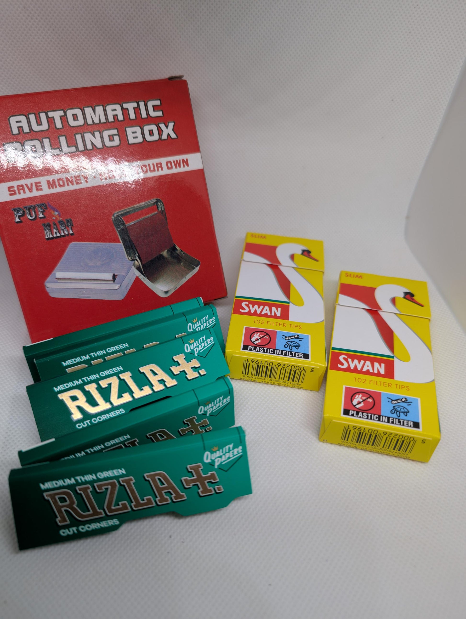 Automatic tobacco rolling machine / box including 2 Packs of Swan Slim tips & 5 x Packs of RIzla Green Standard Rolling Papers