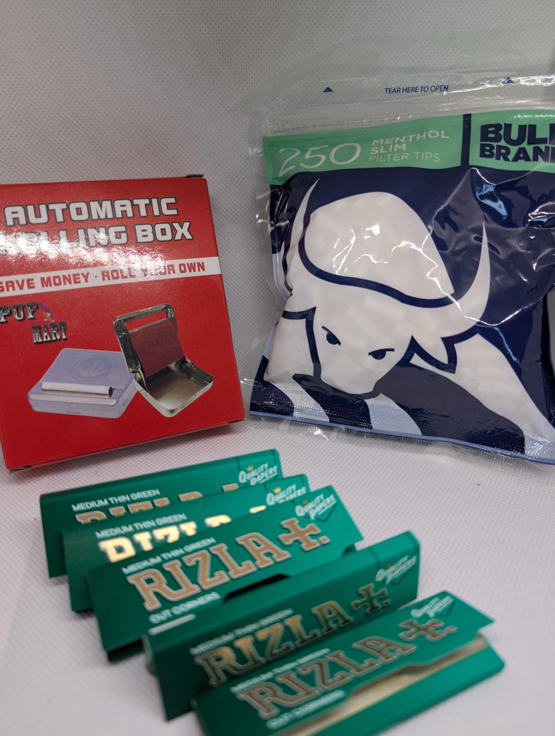 Automatic tobacco rolling machine / box including 250 Bull Brand Menthol Slim tips & 5 x Packs of RIzla Green Standard Rolling Papers
