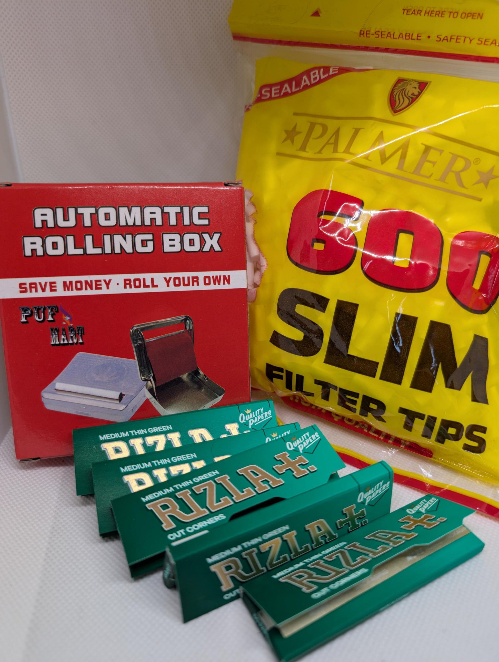 Automatic tobacco rolling machine / box including 600 Palmer Slim tips & 5 x Packs of RIzla Green Standard Rolling Papers